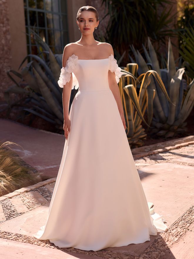 Dieses elegante ausgestellte Meerjungfrau-Kleid ist aus hochwertigem Stretch-Crêpe gefertigt und ärmellos. Das Kleid verfügt über eine wunderschöne, lange Schleppe mit offenem Rücken und einem Bootsausschnitt. Es hat eine natürliche Taillenlinie, die die Silhouette betont. Die Chiffon-Schleifen auf den Schultern sind mit Druckknöpfen befestigt und für einfaches Schließen ist das Brautkleid mit einem Reißverschluss und Haken versehen.